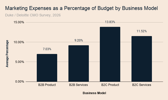B2C product companies spend more than twice what B2B product companies spend, and for structural reasons: they compete for consumer awareness and discovery in a way that demands persistent investment. B2B services firms, which grow more heavily through relationships and referrals, face a different acquisition dynamic and can operate at a lower percentage without sacrificing growth.