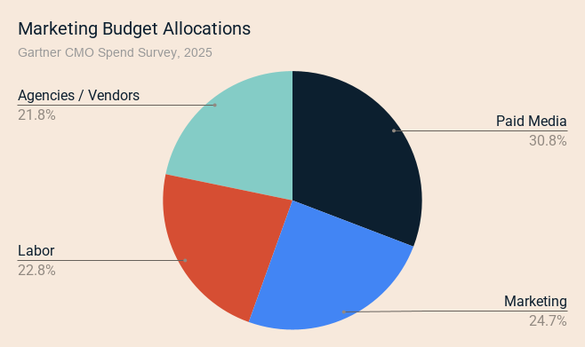 Once you have a total number in mind, the next question is how to deploy it. According to Gartner's 2025 CMO Spend Survey, marketing spend across large enterprises breaks down into four broad categories, and while proportions shift for smaller businesses, the categories themselves are consistent and useful for planning.