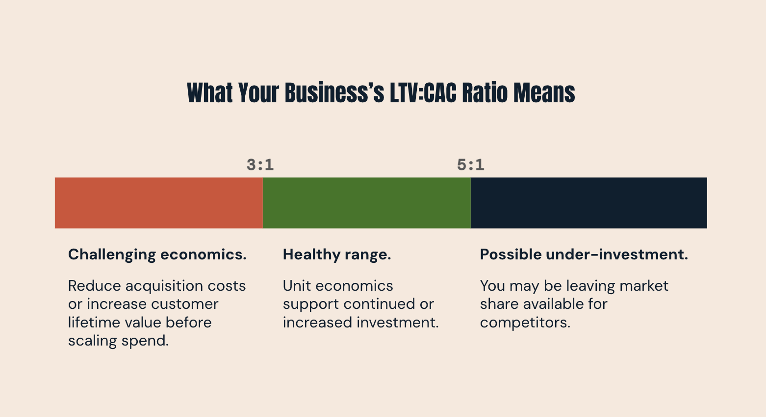 For a CEO pursuing aggressive growth, a 3 to 1 ratio or better is data-backed justification to increase spend toward the destination budget. If your ratio is below 3 to 1, a larger budget will not fix the underlying problem. The right move is to improve conversion rates, strengthen retention, or both, before spending more to acquire customers.